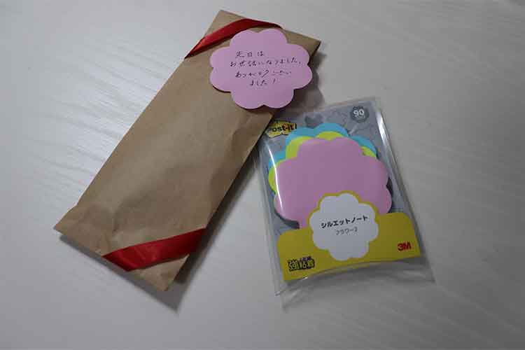 1枚69×69mm、花の形をした付箋です。ちょっとしたプレゼントに添えるメッセージを書くことにも適したカジュアルな付箋です。