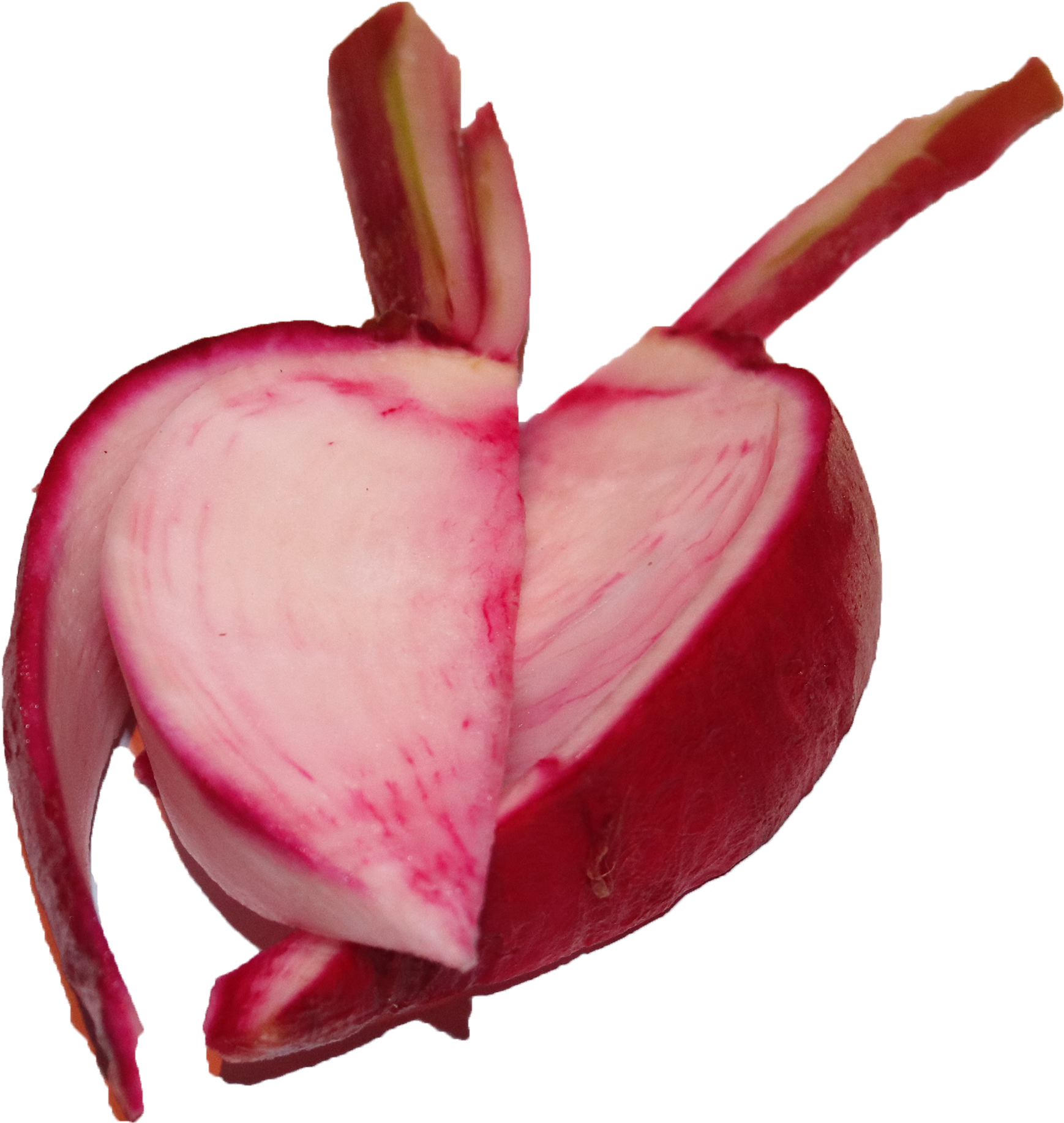 外皮が赤くて中が白い、紅しぐれ大根は、辛味が少なく生食に向いている大根だ。赤色の秘密はアントシアニン。すずきちでは他にも、紅くるり大根や紅心大根、ビタミン大根など、様々なカラー大根を提供している。
