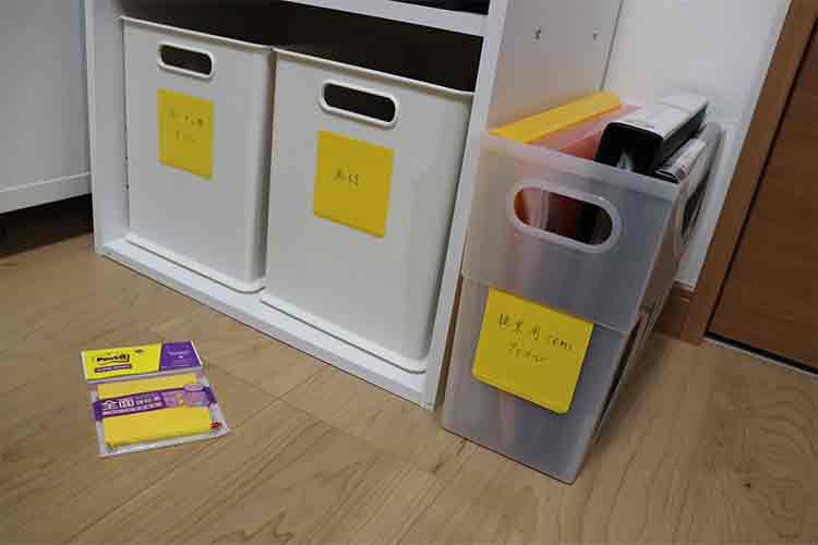 1枚74×74mm、全面にのりがついている付箋です。強力粘着で剥がれにくく、剥がした後も汚れないのでファイルスタンドや収納ボックスなどの樹脂面、垂直面に貼り付けるのにも適しています。