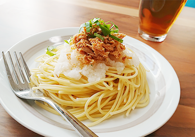 ご飯だけではなく、パンや麺類との組み合わせもバッチリ。 特にオススメなのがパスタアレンジ。茹でたパスタに「めんツナかんかん」 を乗せるだけで、「明太子とツナのオイルパスタ」の完成です。