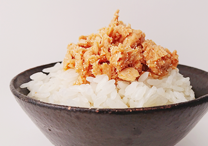 素材そのままのおいしさを楽しむなら、ご飯と一緒に食べるのが一番。 熱々のご飯の上に「めんツナかんかん」を乗せるだけ。 ツナの旨みと唐辛子の程よい辛さがご飯との相性は抜群、箸が止まらないおいしさです。