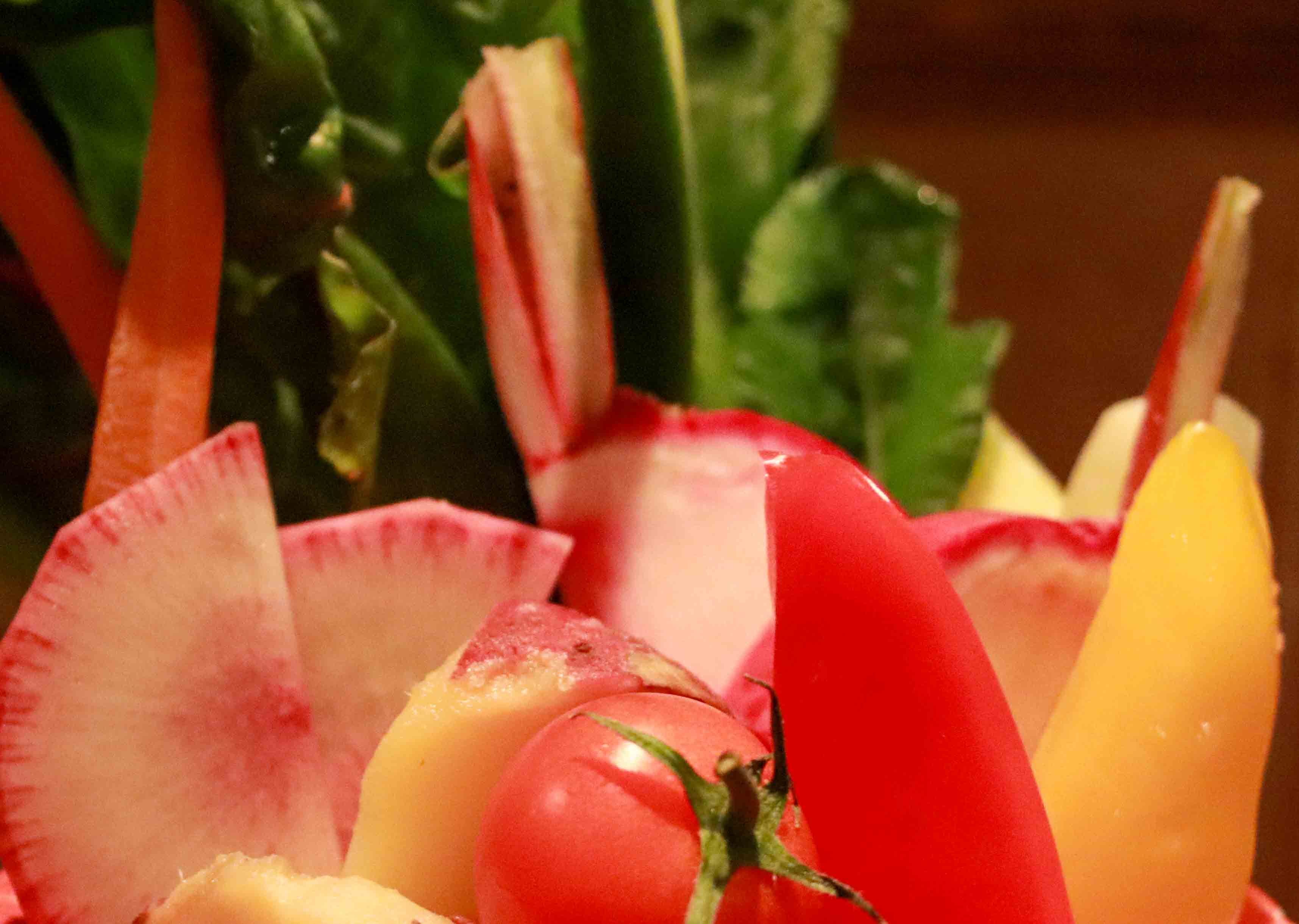 真っ赤な皮と茎の赤カブ。色とりどりの野菜が氷に盛られたバーニャカウダは、見ているだけでも楽しい料理だ。すずきちの看板メニューとして、定番である。