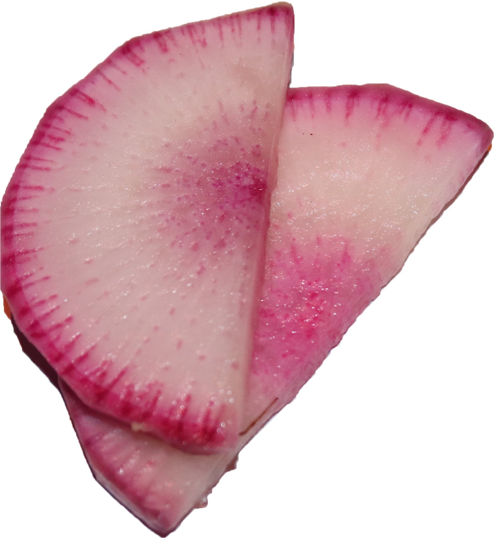 外皮が赤くて中が白い、紅しぐれ大根は、辛味が少なく生食に向いている大根だ。赤色の秘密はアントシアニン。すずきちでは他にも、紅くるり大根や紅心大根、ビタミン大根など、様々なカラー大根を提供している。